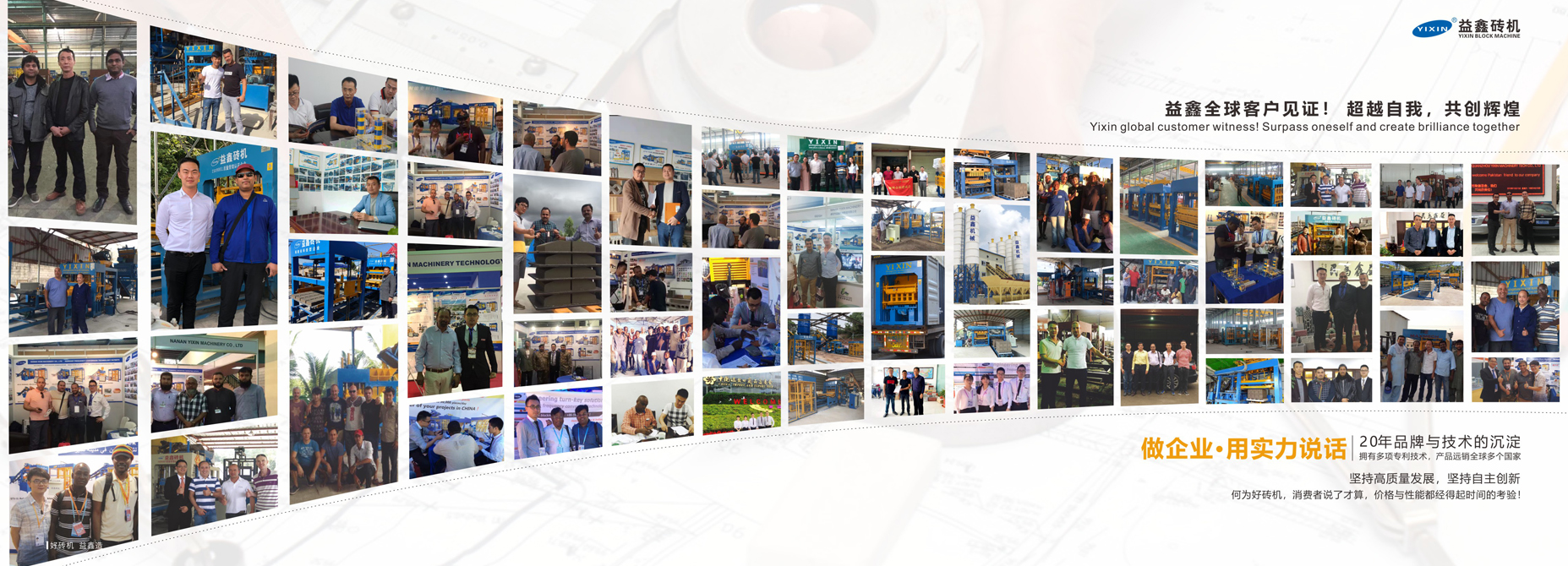 益鑫公司擁有一支研發實力強勁的優秀隊伍,目前公司擁有已授權各項專利技術數十項,益鑫生產的QT/YX系列混凝土砌塊成型機經過十多年的不斷改進和完善,產品規格齊全、性能可靠、質量優異、服務周到及時,廣泛滿足不同用戶的需求,并得到了國內外客戶的充分肯定,出口訂單逐年穩步增加,國內銷量增幅顯著。